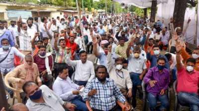 दैनिक वेतनभोगी कर्मचारियों ने मोहन सेन के कार्यालय के सामने जोरदार प्रदर्शन किया