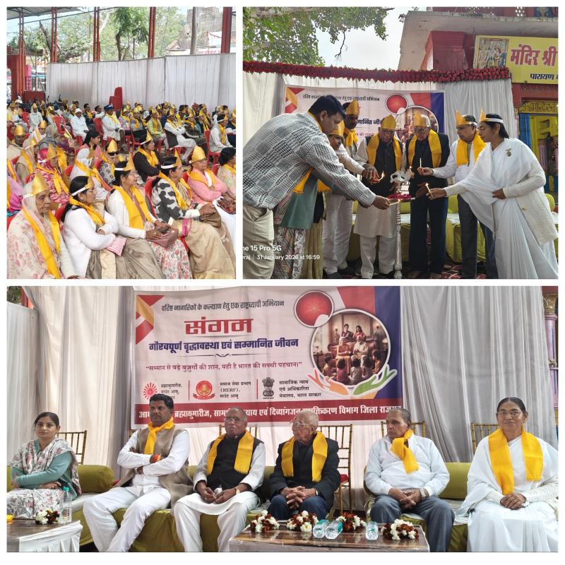 राजगढ़ के पारायण चौक में भारत सरकार के सामाजिक न्याय एवं अधिकारिता मंत्रालय एवं ब्रह्माकुमारीज़ के समाज सेवा प्रभाग के साथ हुए समझौता ज्ञापन के अनुसार चलाए जा रहे राष्ट्रव्यापी अभियान “संगम- गौरवपूर्ण वृद्धावस्था एवं सम्मानित जीवन” विषय पर वृद्धजनों के लिए गरिमामय सम्मान समारोह का आयोजन किया गया।