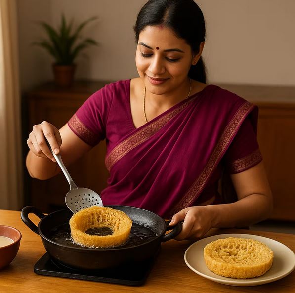 4. जैसे ही बुलबुले शांत हों, फिर से घोल डालें. यह प्रक्रिया 4-5 बार दोहराएं जब तक घेवर गोल और क्रिस्पी शेप में न आ जाए.