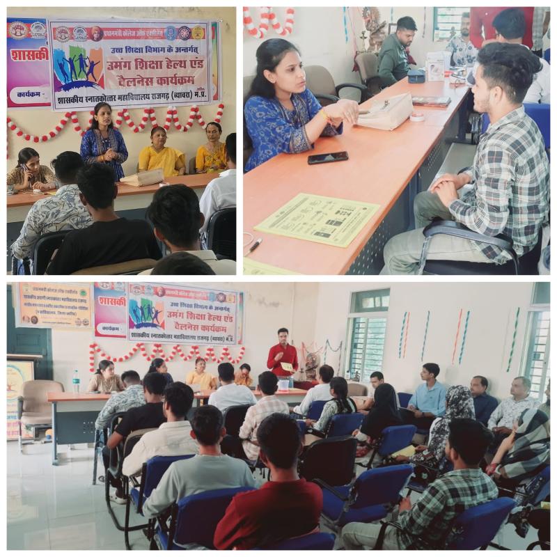 जिसमें मुख्य अतिथि के रूप में प्राचार्य खरे उपस्थित रहे स्वास्थ्य विभाग से उमंग स्वास्थ्य केंद्र की परामर्शदाता तनुषिखा अनंत के द्वारा युवाओं एवं किशोर के लिए शारीरिक और मानसिक स्वास्थ्य क्यों जरूरी है इस पर चर्चा की गई एवं जस्ट आस्क चैट बोट, टेली मानस हेल्पलाइन 14416 के बारे में बताया साथ ही साथ मनकक्ष प्रभारी राहुल राजपूत के द्वारा मनहित ऐप इंस्टॉल करवाया गया और मानसिक स्वास्थ्य और अन्य प्रकार डिसआर्डर के बारे में बताया गया साथ ही उनकी जांच स्वास्थ्य परीक्षण करवाया गया स्वास्थ्य शिविर के दौरान आंखों की जांच, ब्लडप्रेशर की जांच, शुगर की जांच स्वास्थ्य विभाग की टीम के द्वारा की गई एवं आवश्यकता अनुसार दवाइयां प्रदान की उमंग उच्च शिक्षा हेल्थ एवं वेलनेस कार्यक्रम का शुभारंभ 12 जनवरी 2025 को स्वामी विवेकानंद जयंती के अवसर पर मुख्यमंत्री मोहन यादव द्वारा युवा शक्ति मिशन के अंतर्गत किया गया था जिसके अंतर्गत मध्य प्रदेश के चयनित महाविद्यालयों का चयन किया गया है जिसमें पी एम श्री महाविद्यालय राजगढ़ की चयन किया गया स्वास्थ्य परीक्षण शिविर में महाविद्यालय से प्रोफेसर आभा आनंद ,राम गोपाल दांगी, उमंग उच्च शिक्षा हेल्थ एंड वैलनेस कार्यक्रम के प्रभारी सरफराज आलम, NSS प्रभारी शैलेंद्र मेवाडे एवं छात्र-छात्राएं उपस्थित रहे