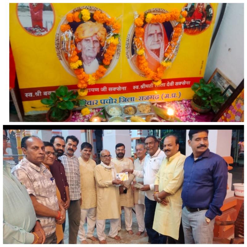 पचोर नगर के खजांची बख्शी परिवार के मुखिया स्व कैलाश नारायण सक्सेना स्व लीला देवी सक्सेना ने 7 अगस्त 2018 को शाम 5 बजकर 16 मिनट पर स्व लीलादेवी सक्सेना का स्वर्गवास हुआ ठीक 7 मिनट बाद स्व कैलाश नारायण सक्सेना का भी स्वर्गवास हुआ था दोनो पतिपत्नी के एक साथ निधन की खबर तुरंत पूरे देश में फैल गई थी बख्शी परिवार के मुखिया ने एक साथ देवलोकगमन किया था।पूरा पचोर नगर देव तुल्य आत्माओं के अंतिम संस्कार में शामिल हुआ।बख्शी परिवार ने अपने मुखिया की याद में हनुमान मंदिर भोजपुरिया सेवा समिति के अध्यक्ष योगेश गोयल को सत्संग सभागार में मार्बल लगाने के लिए सहयोग किया।परिवार के गोविंद प्रसाद सक्सेना रिट शिक्षक सुबोध सक्सेना रिट बैंक पंकज सक्सेना विद्यालय संचालक मनोज सक्सेना कृषक श्रीमती सावित्री सक्सेनारिट शिक्षिका श्रीमती प्रमिला सक्सेनारिट शिक्षिका ने निर्णय लेकर यह पुण्य कार्य में सहभागिता दी।परिवार के मुखिया की पुण्यतिथि 8अगस्त को सरदार पटेल नेत्रालय कोलूखेड़ा नारायणपुर में बनने वाले विशाल आंखों के अस्पताल में एक कक्ष बनवाने हेतु भी संस्था अध्यक्ष राजेंद्र पाटीदार को भी सहयोग दिया। इस अवसर पर परिवार के गोविंद प्रसाद सक्सेना पंकज सक्सेना मनोज सक्सेना राकेश सक्सेना समूह संपादक दैनिक समर्थ सहारा भोपाल मनीष सक्सेना पूर्व प्रदेश प्रवक्ता मयंक सक्सेना अध्यक्ष हिंदू उत्सव समिति पचोर भोजपुरिया हनुमान मंदिर सेवा समिति अध्यक्ष योगेश गोयल सदस्य लक्ष्मीनारायण गेहलोत जगदीश वर्मा पार्षद संजय तिवारी रामेश्वर शर्मा कोषाध्यक्ष पुजारी जगदीश पराशर उपस्थित रहे।बख्शी परिवार ने सत्संग सभागार में फर्श लगाने दिया सहयोग पर समिति अध्यक्ष योगेश गोयल ने आभार प्रकट किया।