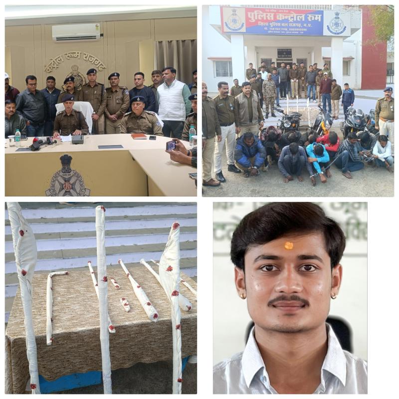 राजगढ़ पुलिस ने सतर्कता, सूझबूझ एवं त्वरित रणनीतिक कार्यवाही करते हुए कुख्यात **पारदी गैंग** द्वारा पेट्रोल पम्प पर डकैती की बनाई जा रही साजिश को विफल किया। पुलिस ने मौके से **10 हथियारबंद बदमाशों** को गिरफ्तार कर एक बड़ी एवं संगीन वारदात को समय रहते रोक लिया।